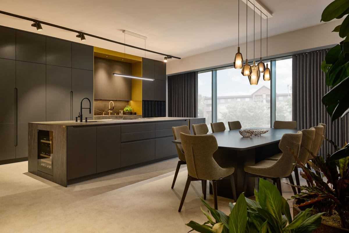Ostravský showroom HANÁK představuje exkluzivní realizaci v rámci Interior Concept, která zaujme promyšlenými detaily a špičkovými materiály. Dominantou prostoru je prémiová kuchyňská sestava SOLID, doplněná prvky LINE, WAVE a COMFORT. Kuchyň v kombinaci laku titan star mat a zlaté metalízy lesk působí luxusně a moderně, zatímco keramická pracovní deska Dekton Laurent dodává prostoru sofistikovaný nádech. Technologickou dokonalost zajišťují spotřebiče BORA, včetně konvektomatu X BO a varného centra se spodním odtahem Bora Professional.